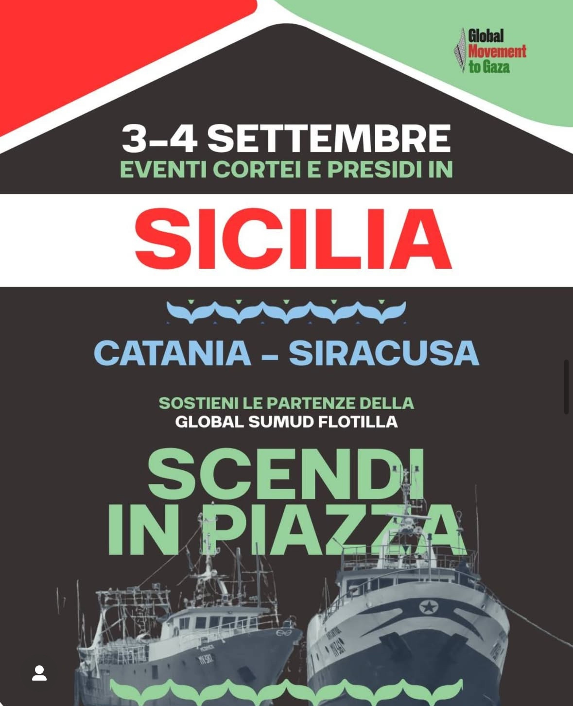 Domani 3 settembre dalle 18 Andrea sarà al Castello Ursino di Catania e Maura al porto di Siracusa. Condurremo gli eventi che precedono la traversata e con noi ci saranno artisti, attivisti, cittadini e cittadine che hanno deciso di non restare a guardare. Non sarà solo una mobilitazione pratica: è un atto di immaginazione politica collettiva, un rifiuto del ruolo di spettatori impotenti davanti a decisioni prese da governi complici. Proveremo insieme a trasformare la disperazione e l’impotenza in organizzazione. In un mondo che ha addestrato la cittadinanza alla testimonianza impotente, l’azione civile e pubblica è già di per sé una ri-educazione dello sguardo.