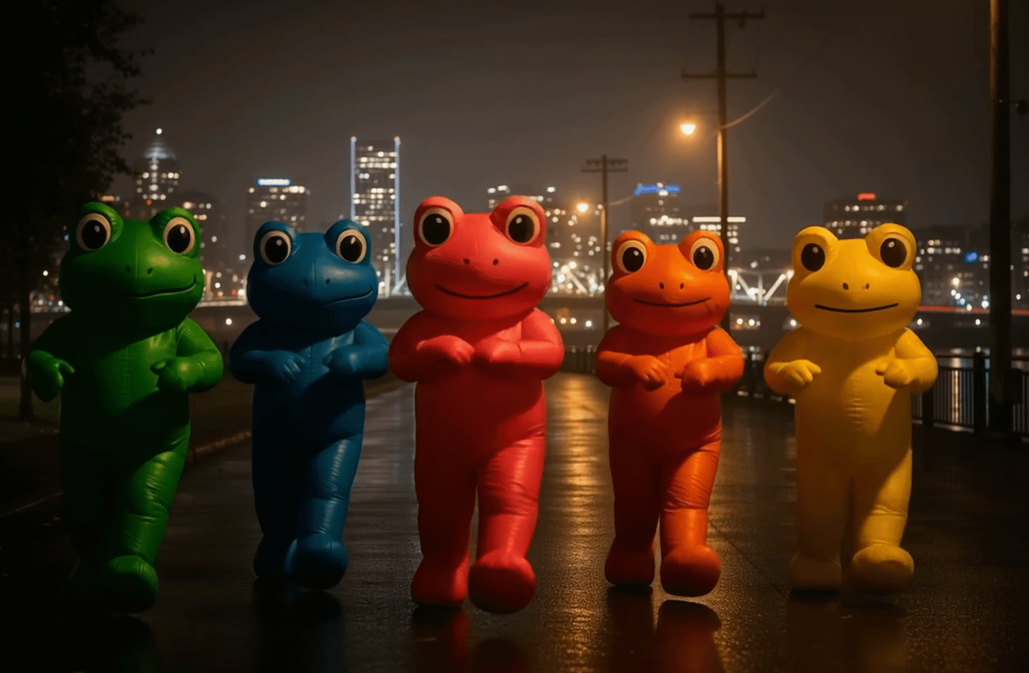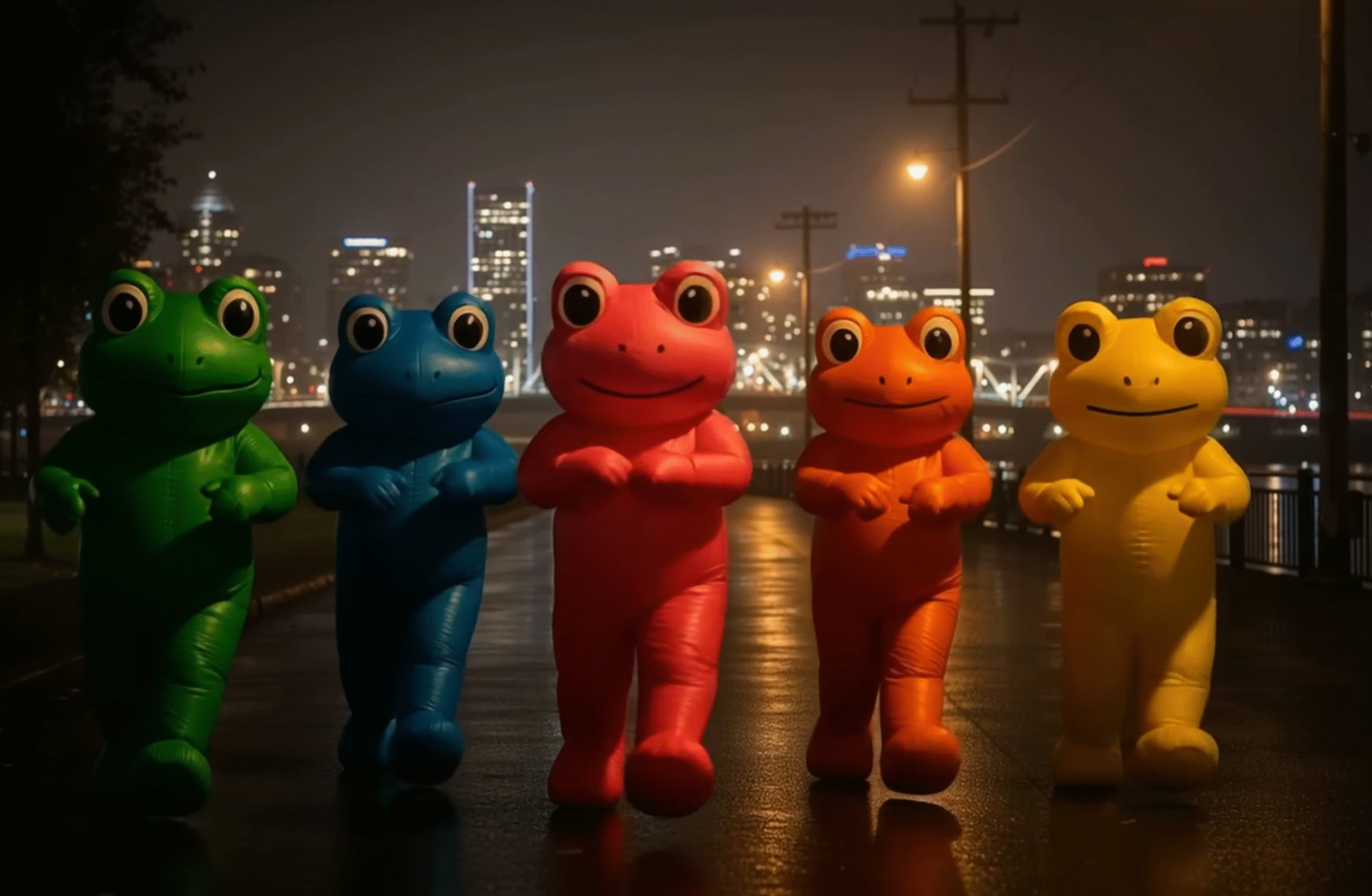 La storia comincia a Portland, in Oregon, nelle proteste contro l’Immigration and Customs Enforcement, dove a un manifestante vestito da rana gonfiabile viene spruzzato dello spray al peperoncino da un agente federale direttamente nella presa d’aria del costume. Il video diventa virale e innesca qualcosa di inaspettato: invece di scoraggiare l’idea di scendere in piazza scatena una moltiplicazione di rane, dinosauri, unicorni, polli, squali, mucche che invadono le proteste in tutto il paese.
