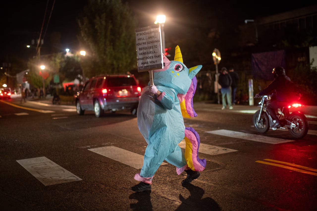 «È davvero difficile definire “zona di guerra” quando quello che vedi è una festa di quartiere con gente in costume di Halloween», dice un manifestante di Los Angeles. Un altro aggiunge: «Stanno cercando di invocare l’Insurrection Act contro Barney il Dinosauro e SpongeBob?».