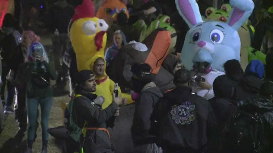 Brooks Brown, uno degli organizzatori di Operation Inflation e streamer per il canale YouTube Quarantine Collective, lo spiega con grande lucidità: nelle proteste tradizionali, i manifestanti si presentano con equipaggiamento protettivo, preparati per i gas lacrimogeni e gli scontri fisici. Le forze dell’ordine arrivano ancora più armate e corazzate, e si innesca un circolo vizioso in cui si crea una profezia che si autoavvera. Ma se a un ufficiale federale in assetto antisommossa si presenta davanti un dinosauro gonfiabile che saltella o un unicorno che balla, o una rana gigante che sventola gioiosa la bandiera americana, l’intera narrazione dei “manifestanti cattivi” crolla.