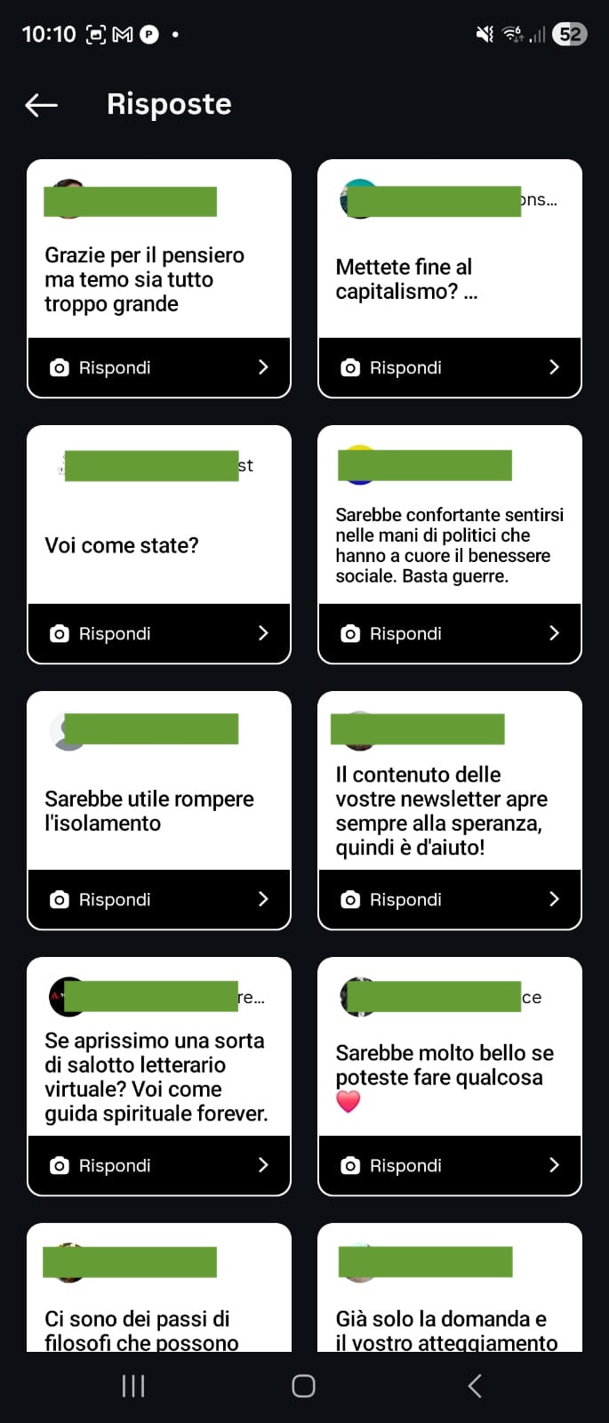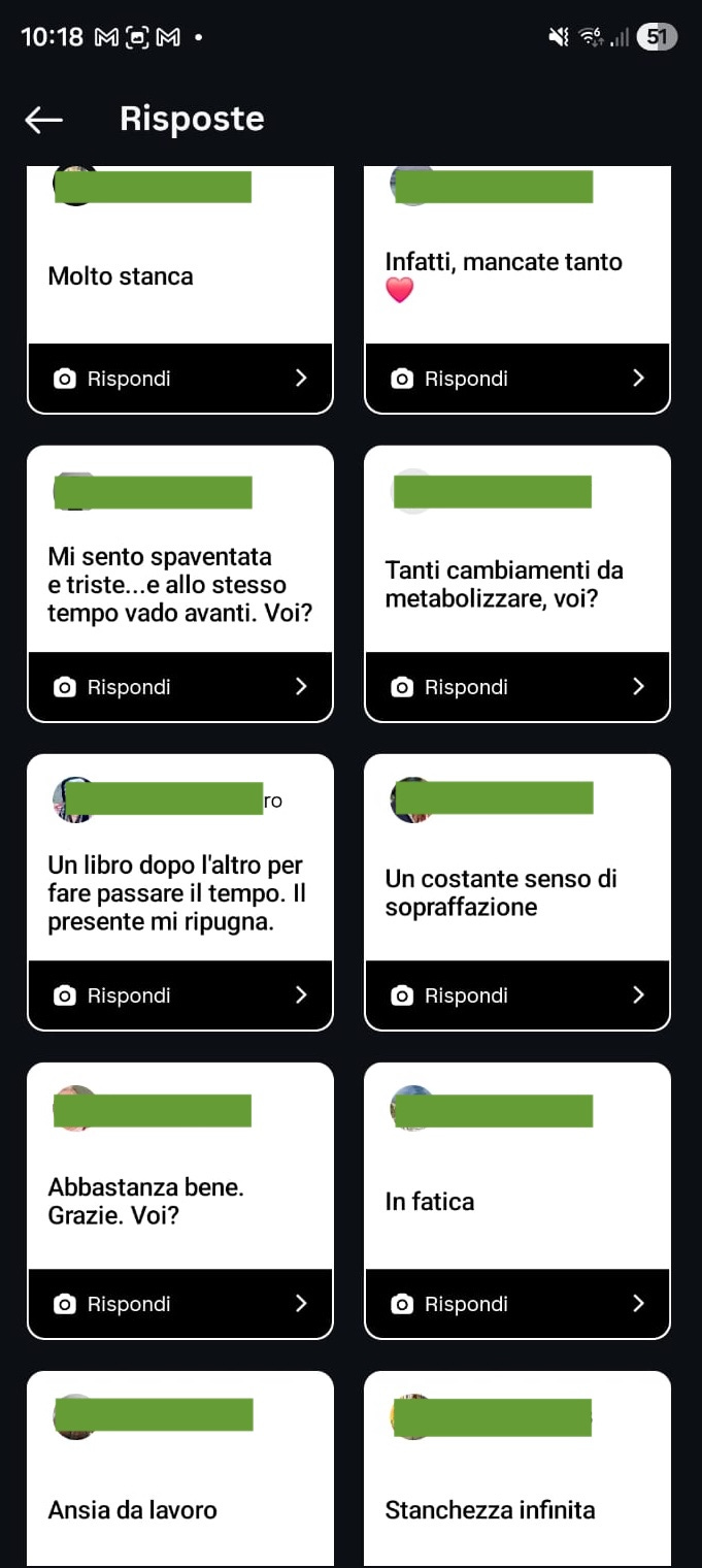 Mi viene in mente una distinzione che faceva Byung-Chul Han tra stanchezza solitaria e stanchezza fondamentale. La prima isola, la seconda (quella che nasce dal fare insieme, dal condividere un’impresa) apre spazi di comunità. Il problema è che la stanchezza che emerge da questi messaggi è quasi interamente del primo tipo: una fatica che separa, che rende incapaci di stare con gli altri proprio nel momento in cui se ne avrebbe più bisogno. Si è troppo esausti per connettersi, e l’isolamento esaurisce ulteriormente. Il circolo è perfetto nella sua crudeltà.