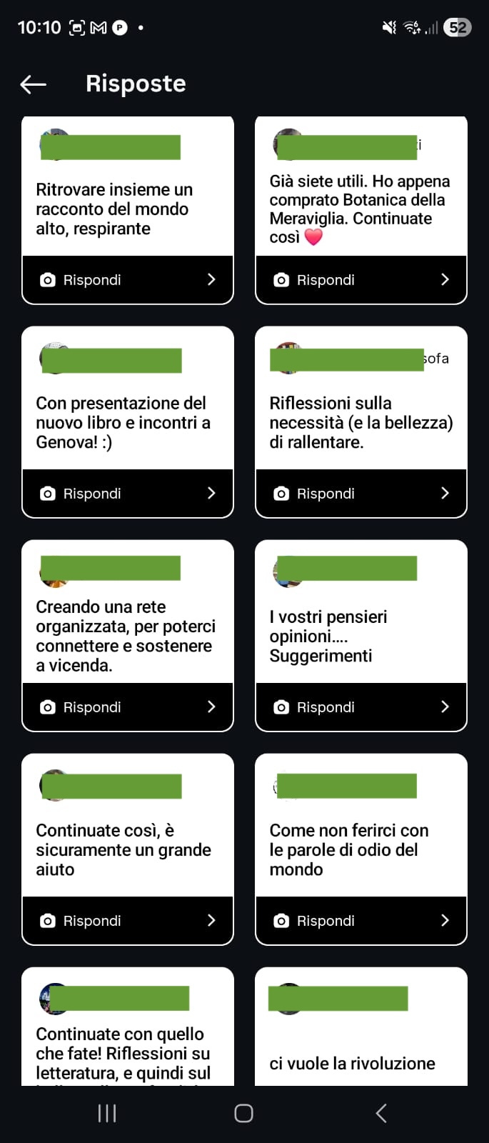 A parte il “mettere fine al capitalismo” e “la rivoluzione” che sono un tantino fuori portata (per quanto forse siano un po’ il punto centrale della questione), per il resto delle risposte il senso più diffuso è “continuate a fare quello che fate” e “fateci sentire pensati”. Il che mi ha un po’ commosso, lo ammetto. Alcuni messaggi, poi, citano la possibilità di creare una rete di supporto per rompere l’isolamento. Non tanto spazi guidati da noi (che siamo solo due, e io tendenzialmente sarei un misantropo), ma un momento in cui sapere che c’è qualcuno di affine. Dopo la crisi dei luoghi di ritrovo fisici, le persone vivono un senso radicale di isolamento iperconnesso. Servirebbe qualcosa, credo sia l’idea di chi ha scritto quei messaggi, che le aiuti ad arcipelagarsi (sono molto soddisfatto di questo neologismo che ho appena coniato, che all’inizio suona strano ma dopo poco ci si abitua).