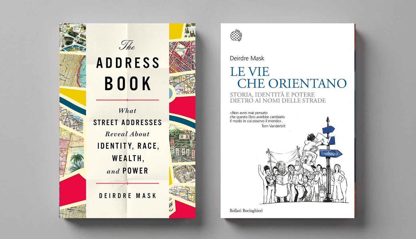Mask (no, non Musk), avvocata formatasi a Harvard e Oxford, viaggia dall’antica Roma, dove la gente si orientava in una città quasi priva di nomi di strade, fino alla New York di oggi, dove un indirizzo può rivelare la provenienza e la classe sociale di chi ci abita (e dove Donald Trump ha costruito un impero anche sul prestigio di certi numeri civici). Lungo il percorso si incontrano le vie intitolate a Martin Luther King Jr., quasi sempre situate nei quartieri più poveri delle città americane, i fantasmi nazisti che abitano ancora la toponomastica tedesca, la via Bobby Sands a Teheran, e gli slum di Calcutta dove milioni di persone vivono senza un indirizzo, ossia senza la possibilità di aprire un conto in banca e candidarsi per un lavoro.